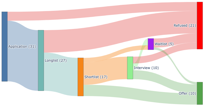 For what it is worth, here is a Sankey plot of my 31 applications: