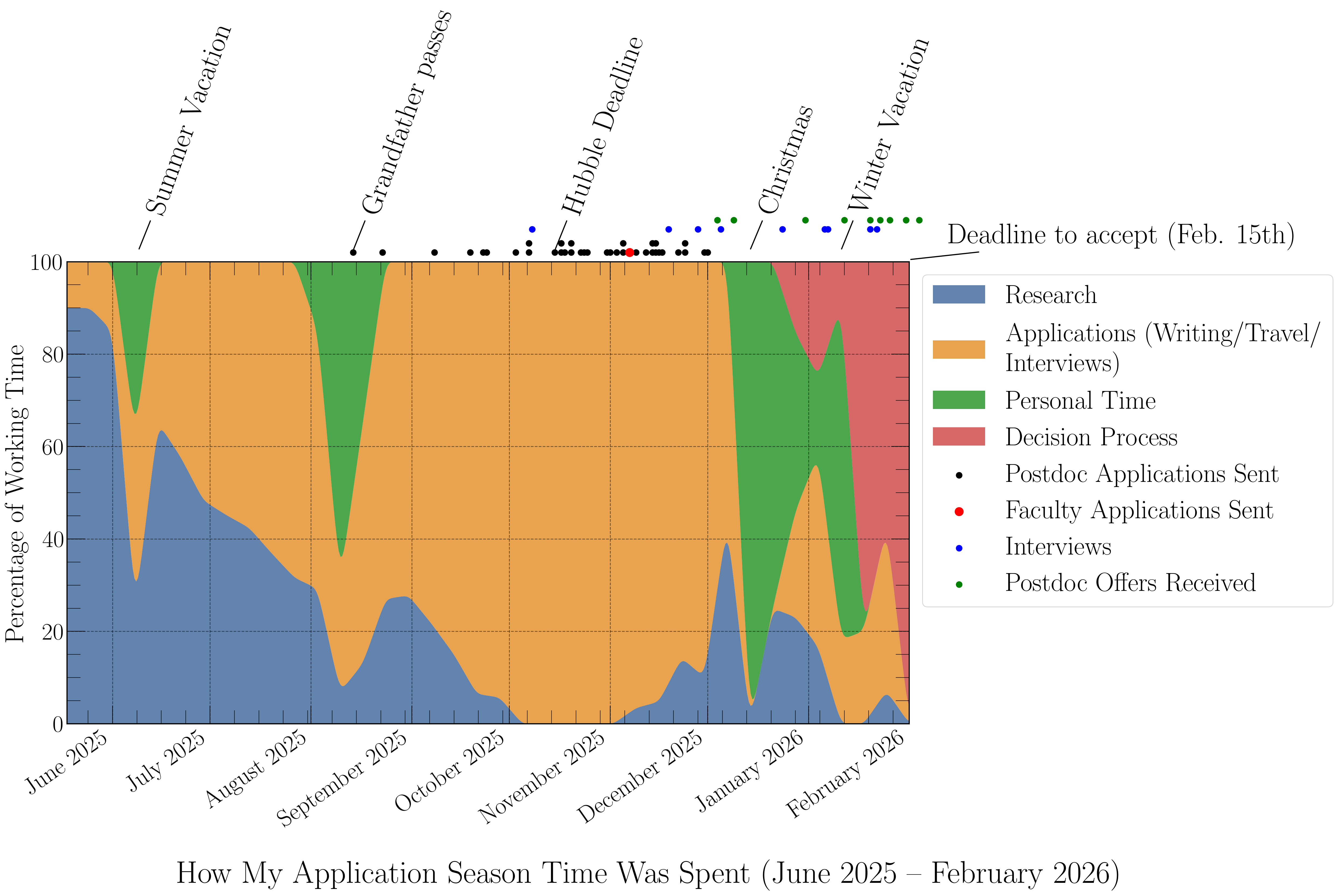 Starting in September, applications begin trickling in — Society of Fellows nominations happen early, and some non-astronomy positions (physics, AI) have earlier deadlines. By October and November, the volume becomes intense. You can see in the figure that applications (writing, travel, interviews) rapidly take over the majority of my working time. The main Hubble/Brinson deadline is typically in mid-November, but there are many other deadlines scattered throughout October, November, and December. This is also when interview travel kicks in.