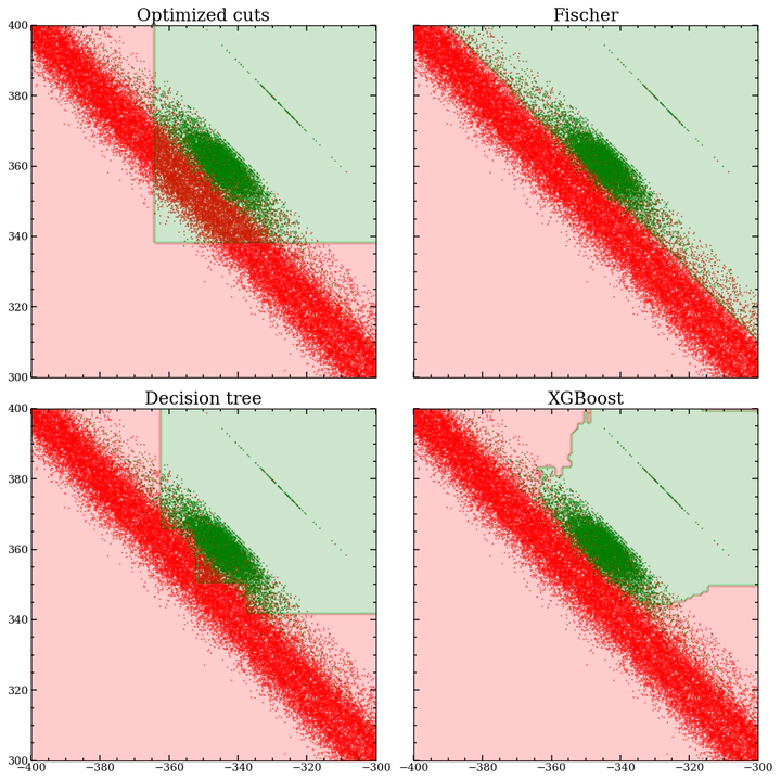 As can be seen in the top figure, among some of the methods tried were simply doing some linear cuts in the feature space, found by simple annealing, using Fisher’s discriminant analysis, a simple decision tree and some boosted decision tree algorithms, of which XGBoost ended up being the method of choice. We ended up getting an accuracy of 99.7% for classyfing signal and background.